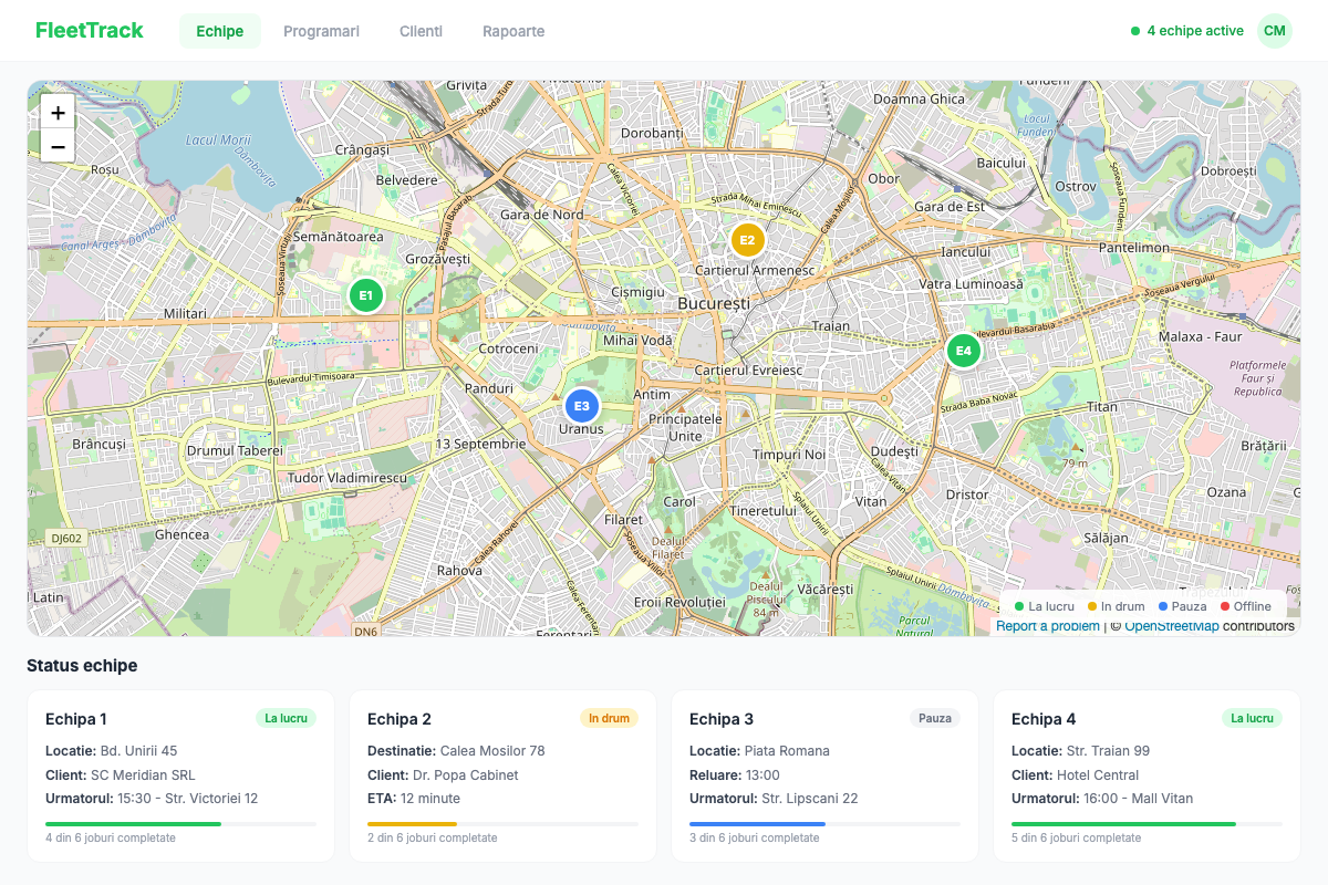 App programare echipe cu status live, notificari client si rapoarte automate. Stii mereu unde e fiecare echipa.
