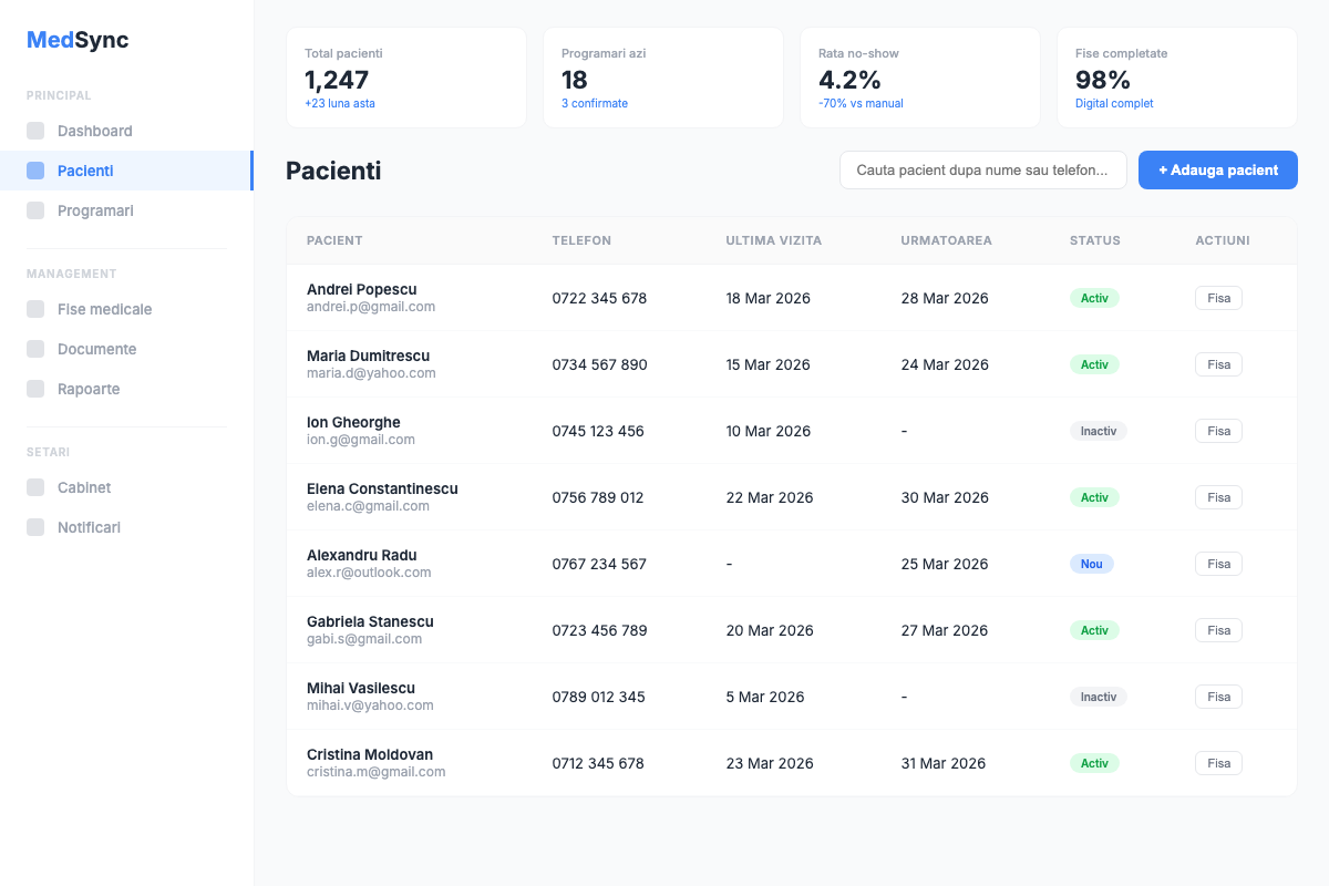 Sistem programari online cu confirmare automata, fise pacienti digitale si reducere no-show cu 70%.