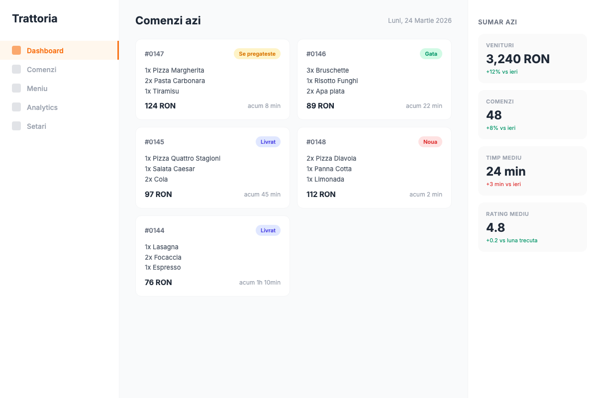 Sistem de comenzi online cu dashboard pentru bucatarie. Meniu digital, notificari real-time, analytics zilnice.